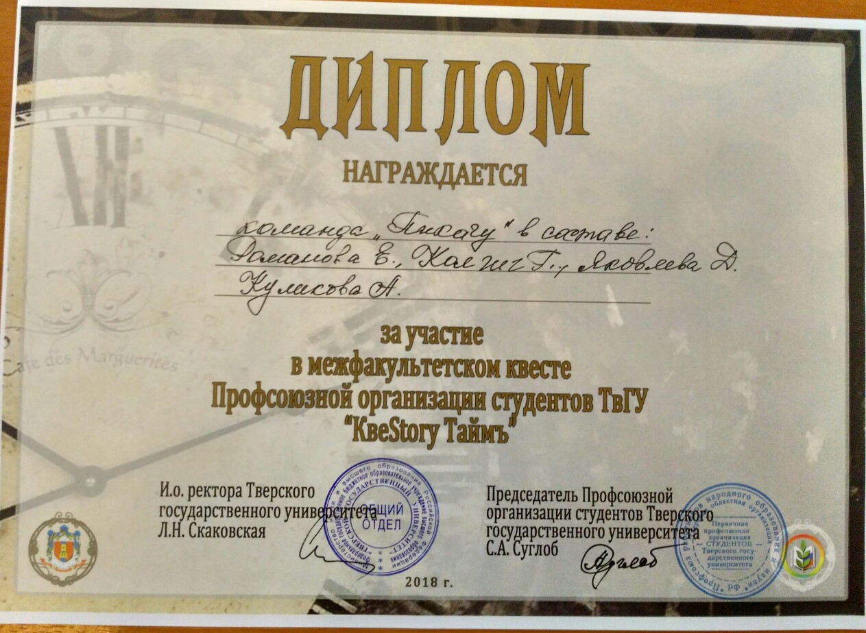 1.5 Участие в межфакультетском квесте Профсоюзной организации студентов ТвГУ "КвеStory Таймъ"