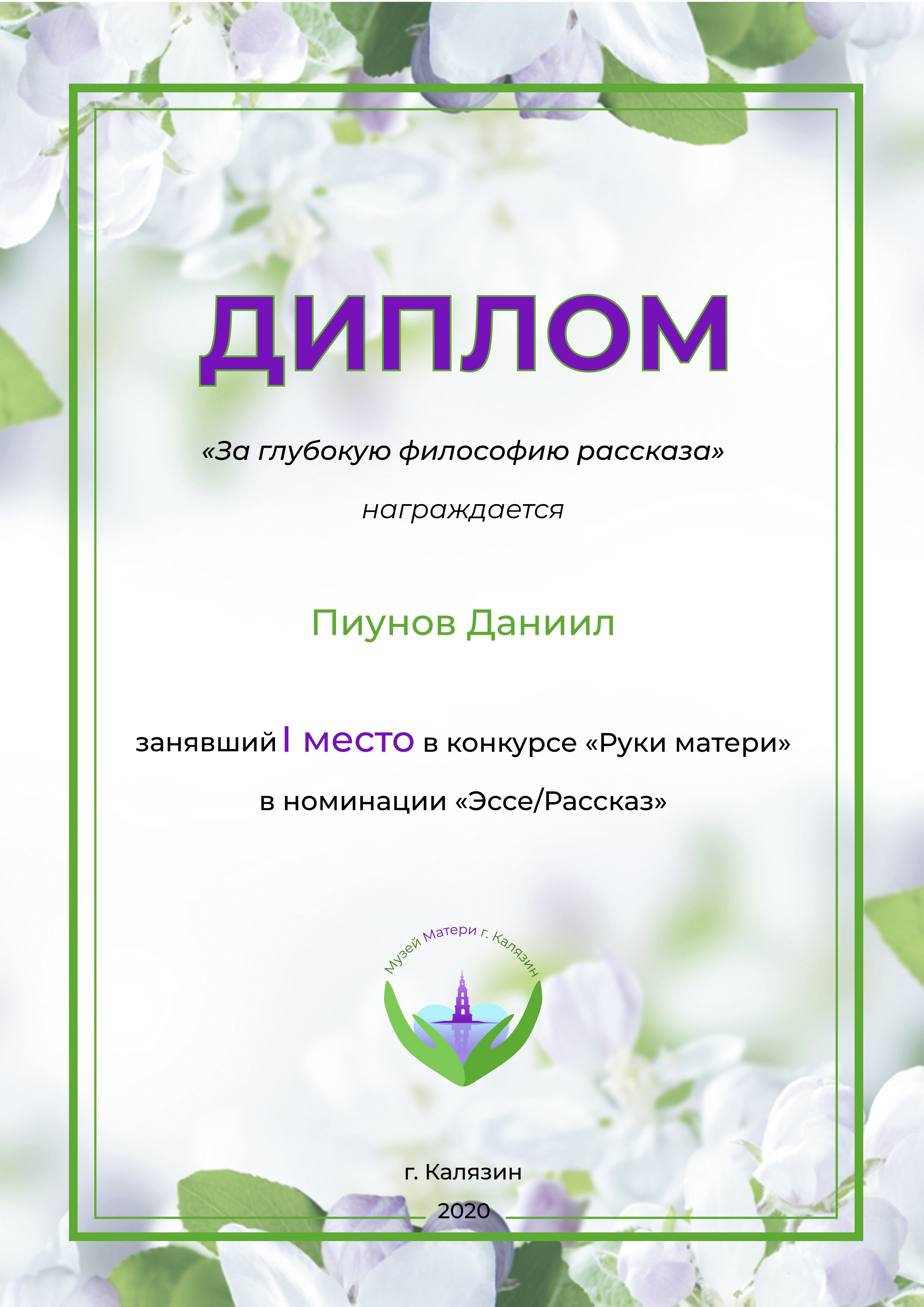Победа в конкурсе, организованном "Музеем Матери" города Калязина.