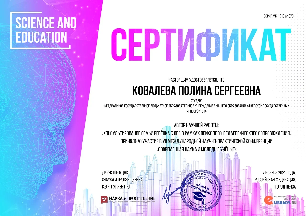 V Международная студенческая научно-практическая конференция «Современная педагогика и психология: проблемы и перспективы» 01.03.2022 г. - сертификат участия.