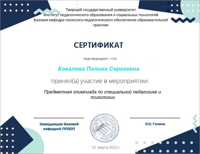 Предметная олимпиада по специальной педагогике и психологии г. Тверь, 2022 г. – сертификат участия.