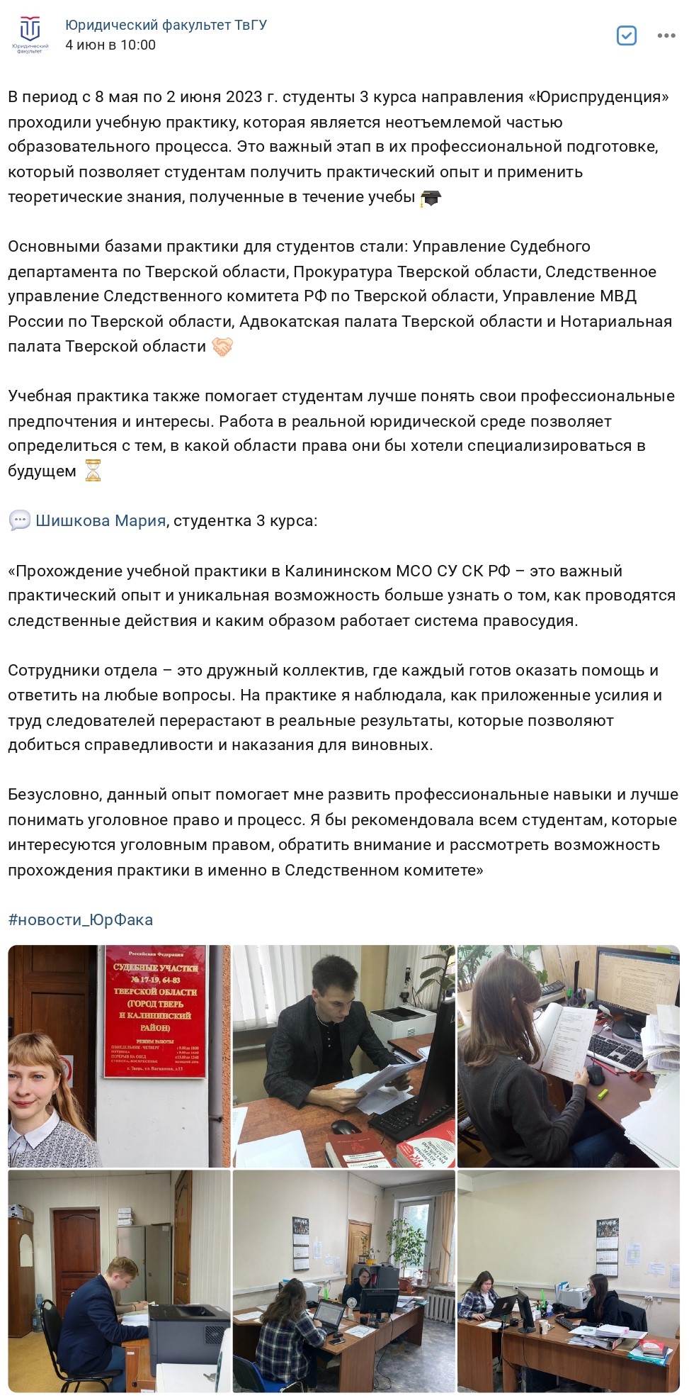 В период с 08.05.2023 по 04.06.2023 я проходила практику в Калининском межрайонном следственном отделе следственного управления Следственного комитета Российской Федерации по Тверской области. Практика являлась учебной. За время прохождения практики я ознакомилась с работой следователей Калининского МСО СУ СК, старших лейтенантов юстиции – Федюниной Анастасии Викторовны, Лукашова Глеба Александровича, Никифорова Александра Алексеевича следователя Второго отдела по расследованию особо важных дел, старшего лейтенанта юстиции – Магомедова Ризвана Магомедовича.