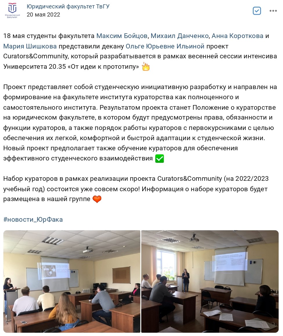 После окончания интенсива мы начали реализовывать проект и создали постоянно действующий институт кураторства на факультете.