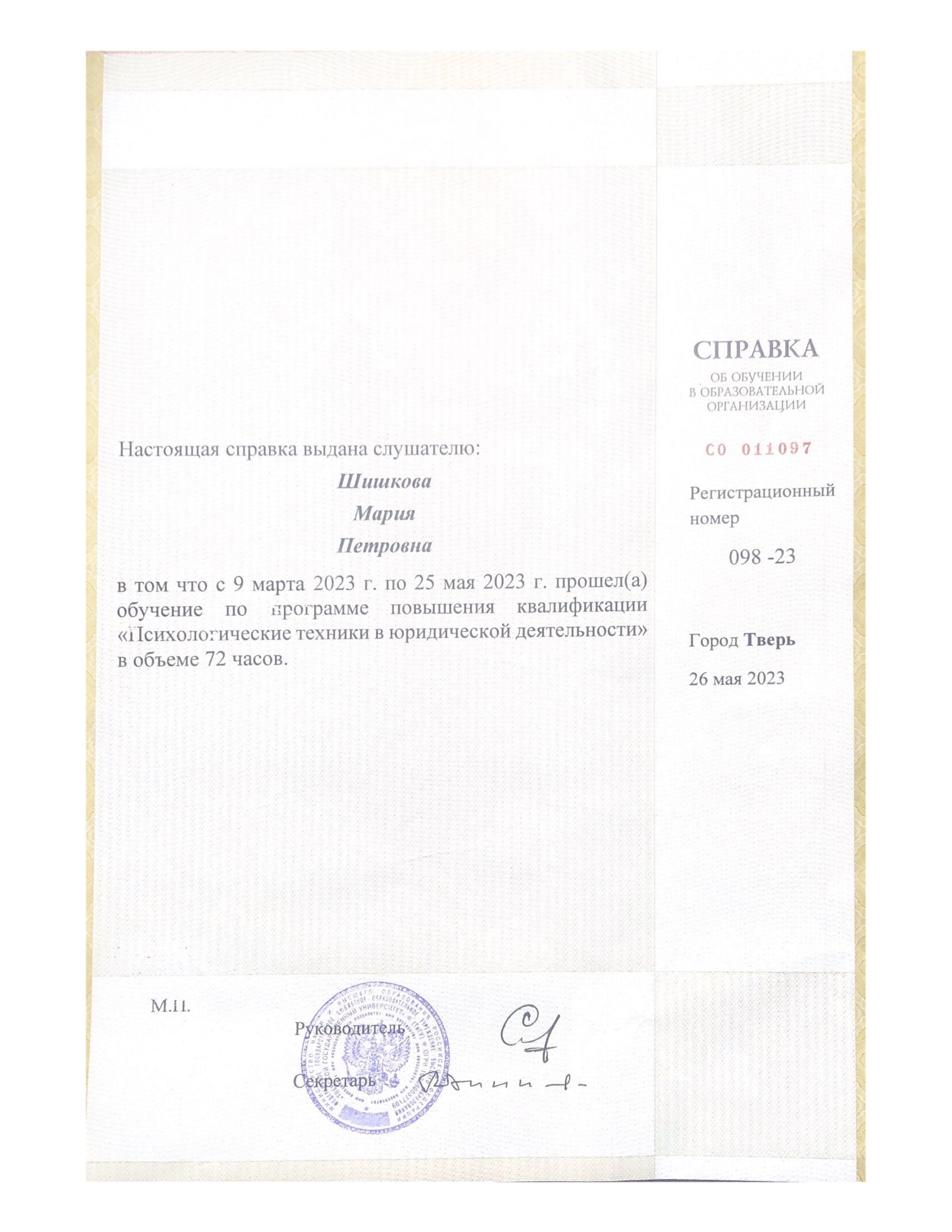 В период с марта по май 2023 года (6 семестр 3 курса) прошла курс повышения квалификации "Психологические техники в юридической деятельности"