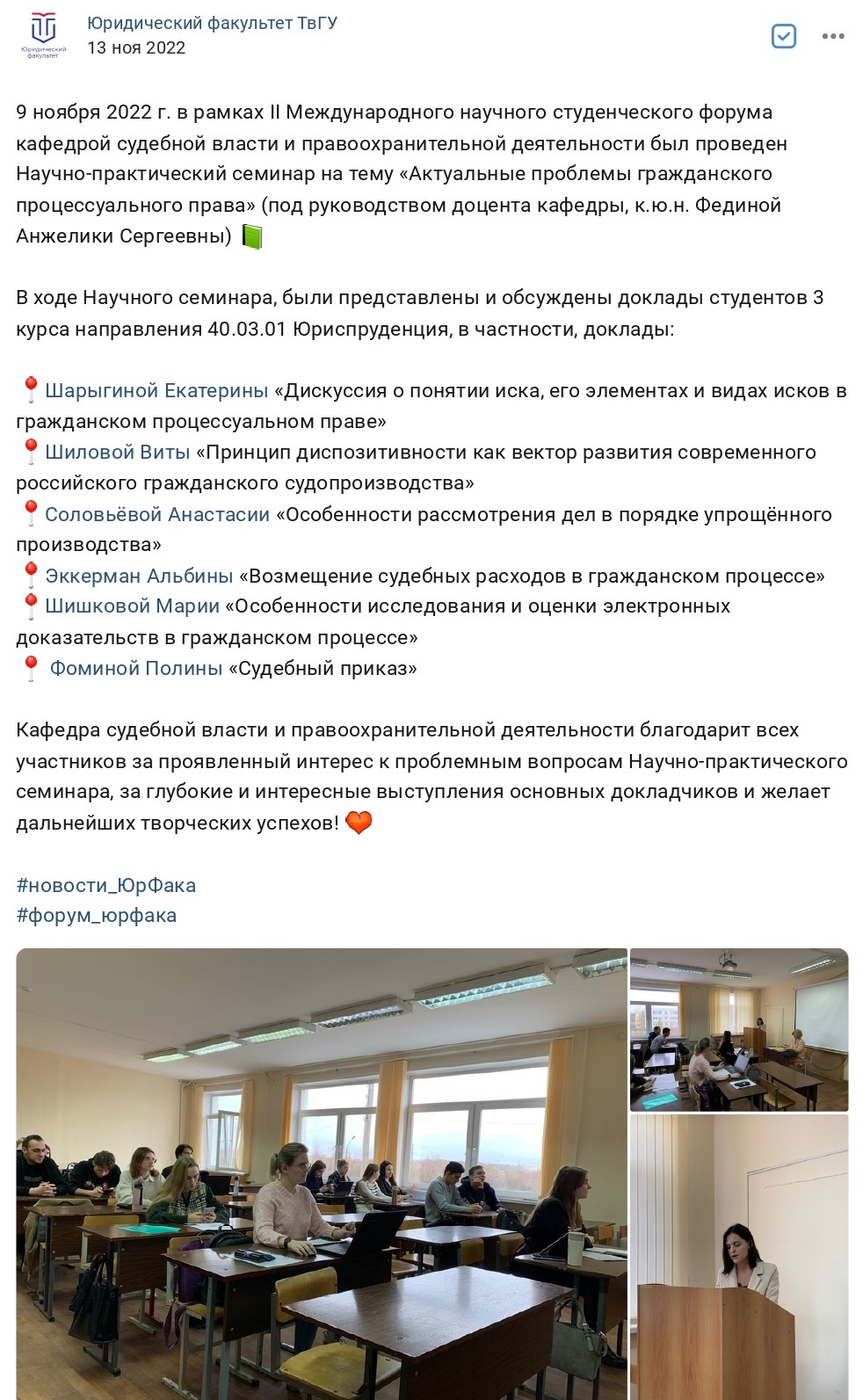 16 ноября 2022 года  в рамках осенней сессии II Международного студенческого научного форума на юридическом факультете состоялся