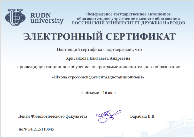 • Дистанционное обучение по программе дополнительного образования "Школа стресс-менеджмента (дистанционный)", в объеме 16 академических часов.