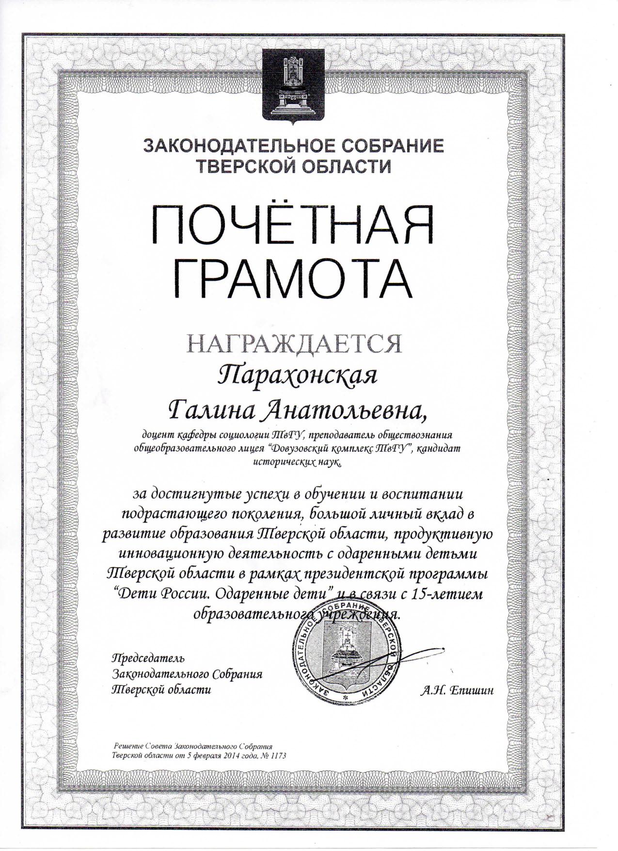 4.5 Почётная грамота Законодательного Собрания Тверской области 2014 г.