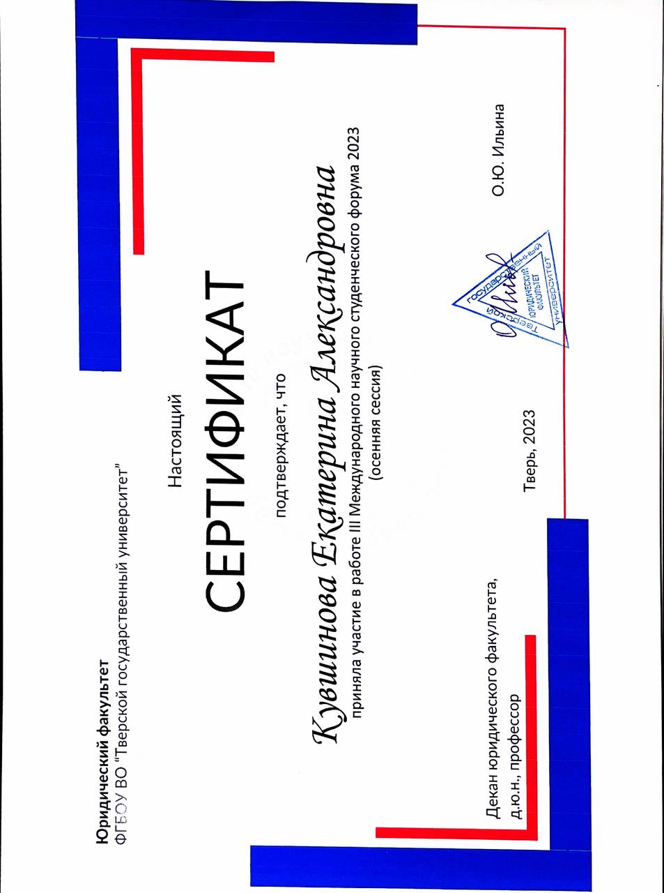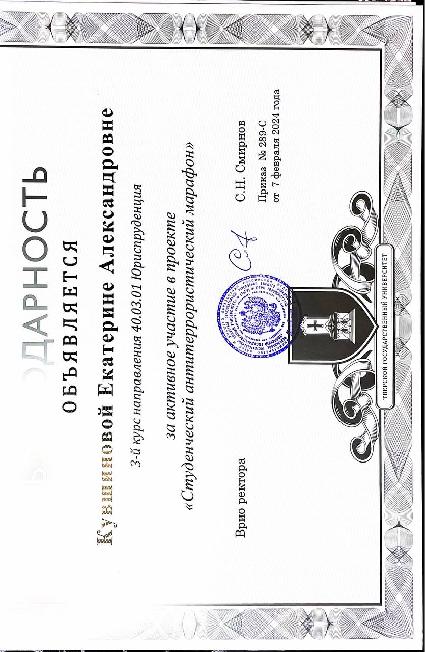 - с начала 3 курса активно участвовала в создании проекта "Студенческий антитеррористический марафон" и в течение года выступала перед студентами нашего университета https://law.tversu.ru/news/30128 . Также нам удалось выступить на региональном «Профилактическом марафоне» для обучающихся образовательных организаций среднего профессионального образования, организованном Министерством молодежной политики Тверской области https://vk.com/wall-191105701_109147 февраля 2024 года за активное участие в проекте "Студенческий антитеррористический марафон" получила благодарность врио ректора ТвГУ.
