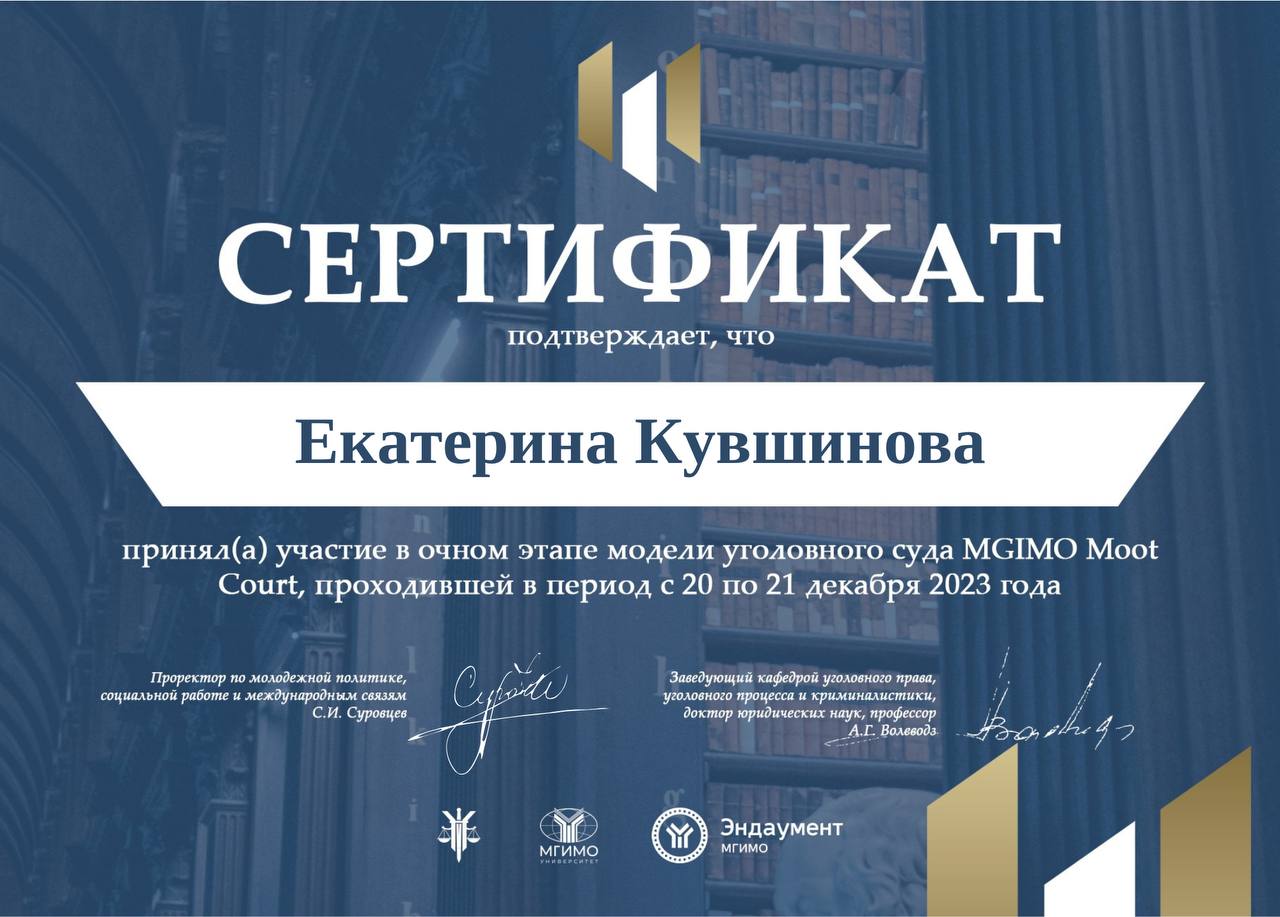 - приняла участие в конкурсе от МГИМО МИД России «Модель уголовного суда MGIMO Moot Court» — всероссийском проекте, реализуемом в целях развития и совершенствования юридических навыков студентов в сфере уголовного и уголовно-процессуального права (суд оправдал нашего подзащитного) https://tversu.ru/news/30580