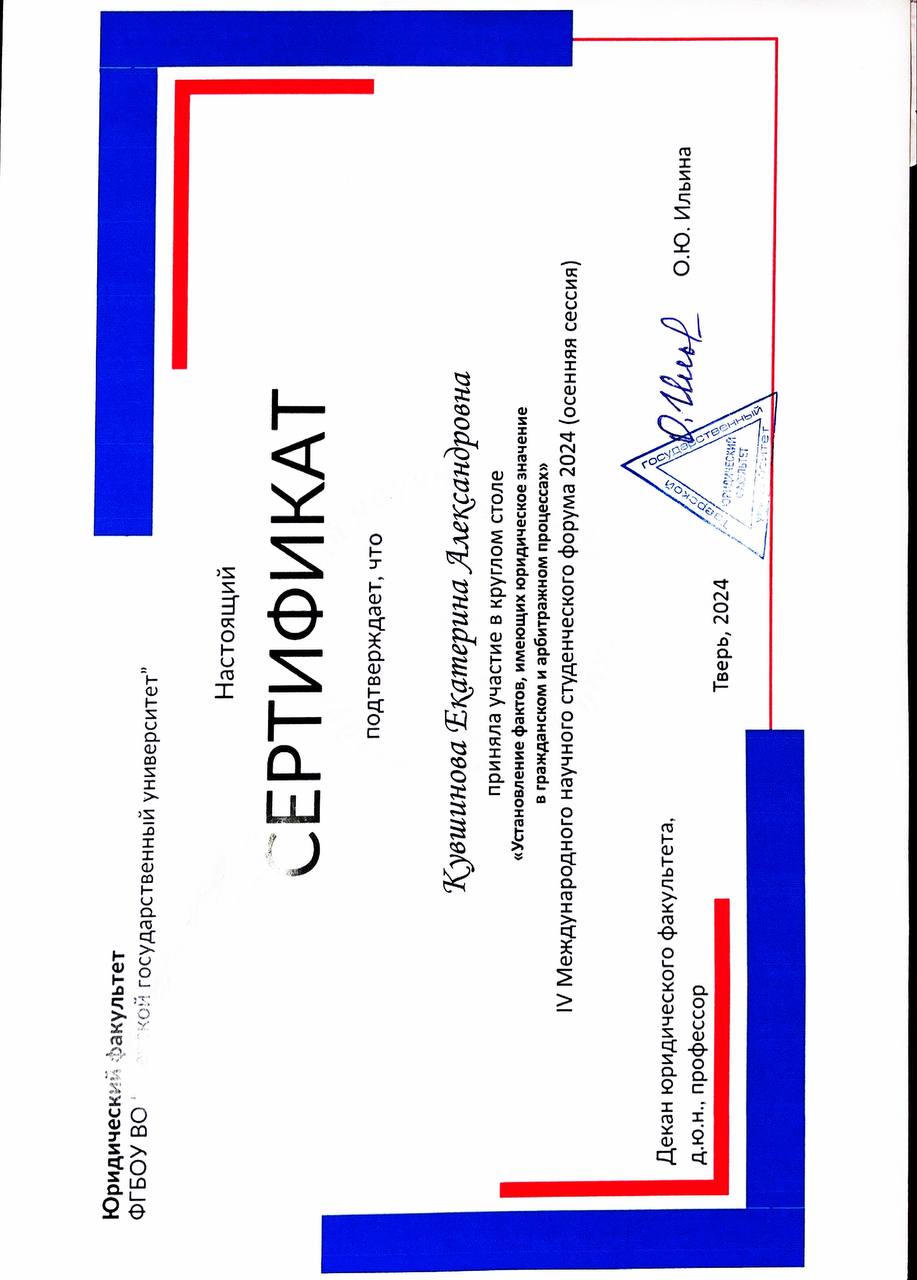 - приняла участие в круглом столе "Установление фактов, имеющих юридическое значение в гражданском и арбитражном процессах" IV Международного научного студенческого форума 2024.