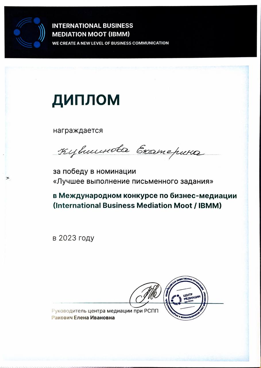 - принимала участие в Международном конкурсе по бизнес-медиации (International Business Mediation Moot/IBMM) -2023, который проходил в НИУ "Высшая школа экономики". Наша команда одержала победу в номинации "Лучшее выполнение письменного задания" https://vk.com/wall-17922145_20703Ссылки на внешний сайт.