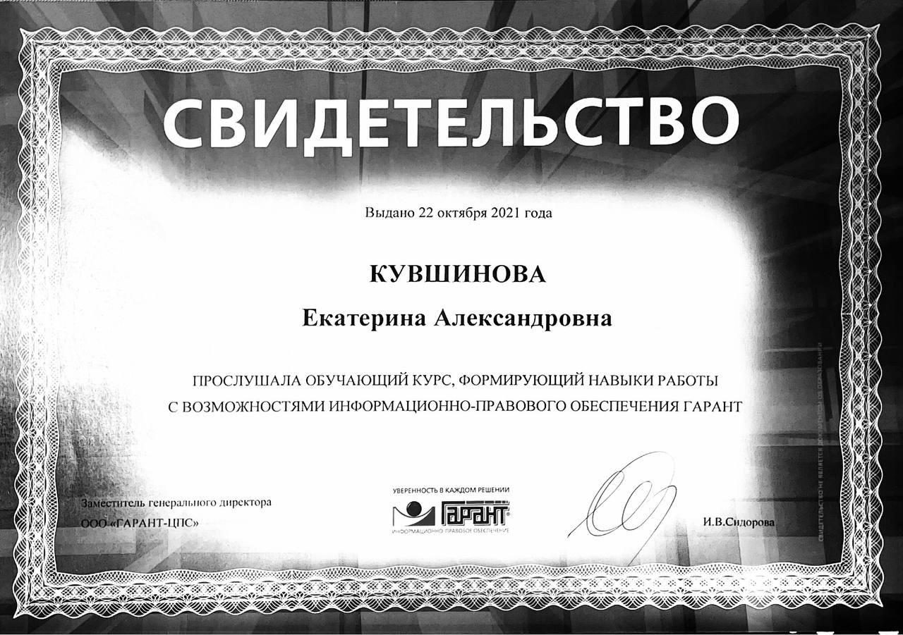 - прослушала обучающий курс от "ГАРАНТ", формирующий навыки работы с возможностями соответствующей системы