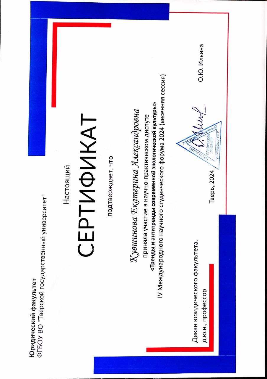 - весной 2024 участвовала в научно-практическом диспуте "Тренды и антитренды современной экологической культуры" IV Международного научного студенческого форума 2024.