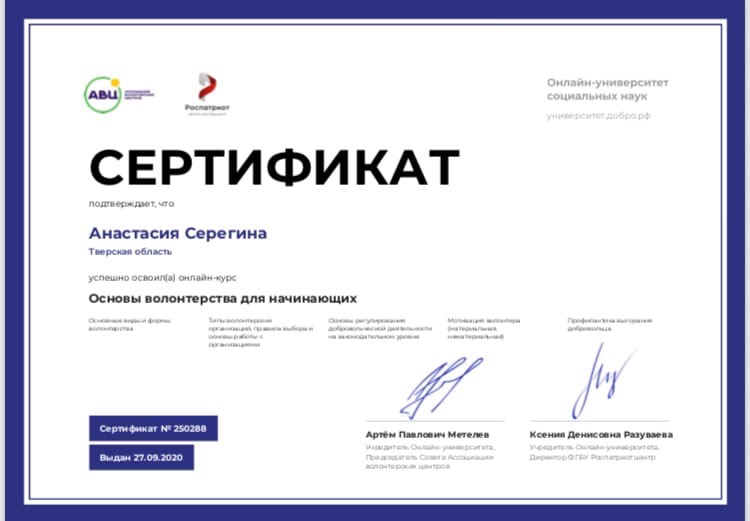 Сертификат "Основы волонтерства для начинающих