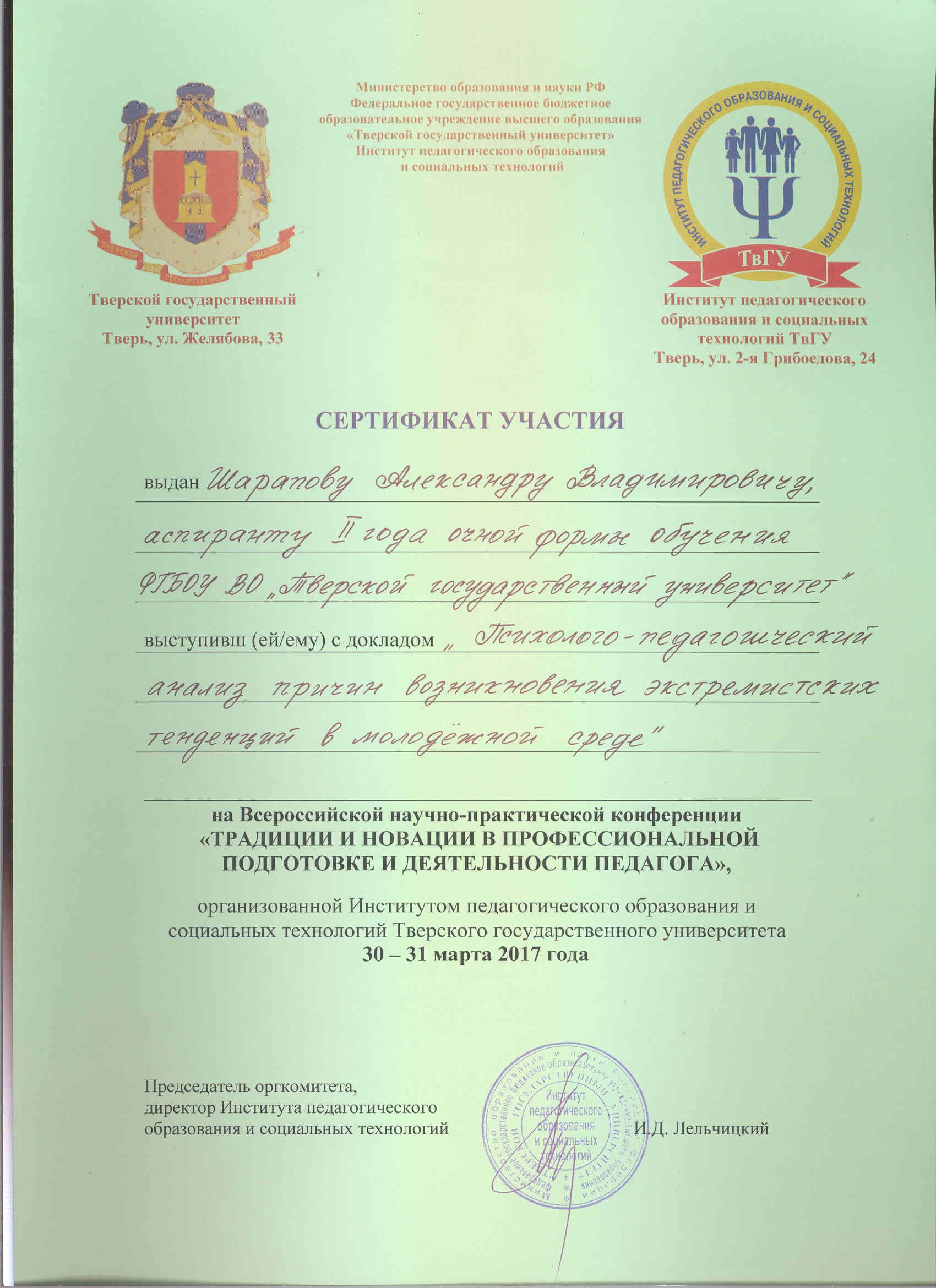 1) Всероссийская научно-практическая конференция "Традиции и новации в профессиональной подготовке и деятельности педагога" (Тверь, 30-31 марта 2017 г.)