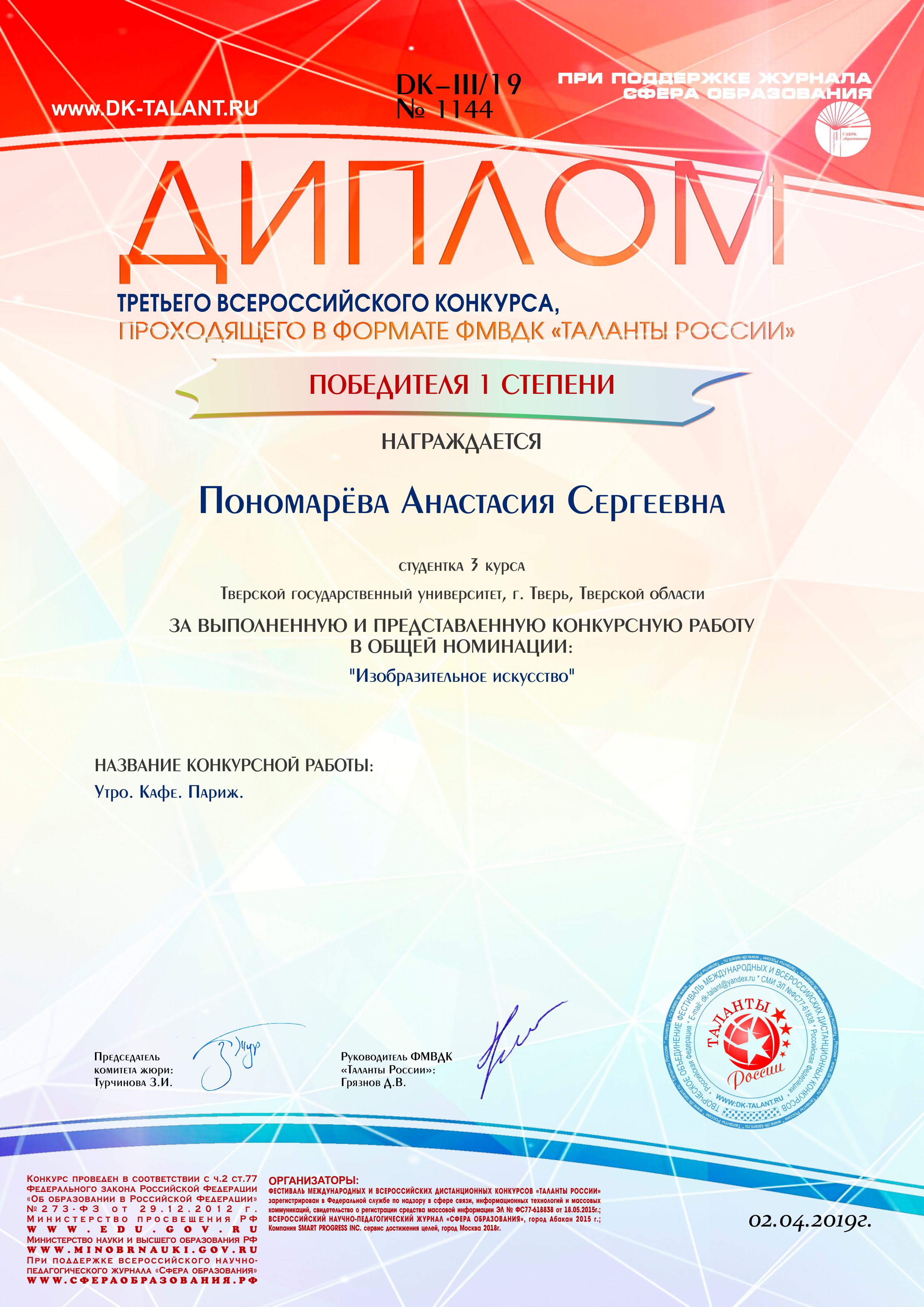 Победитель онлайн-конкурса "Таланты России" в номинации "Изобразительное искусство".