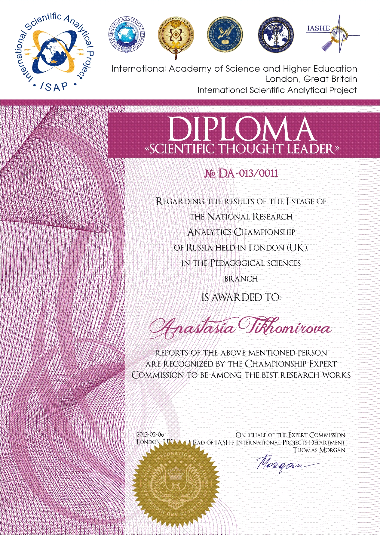Диплом «Лидер научной мысли» (2013):