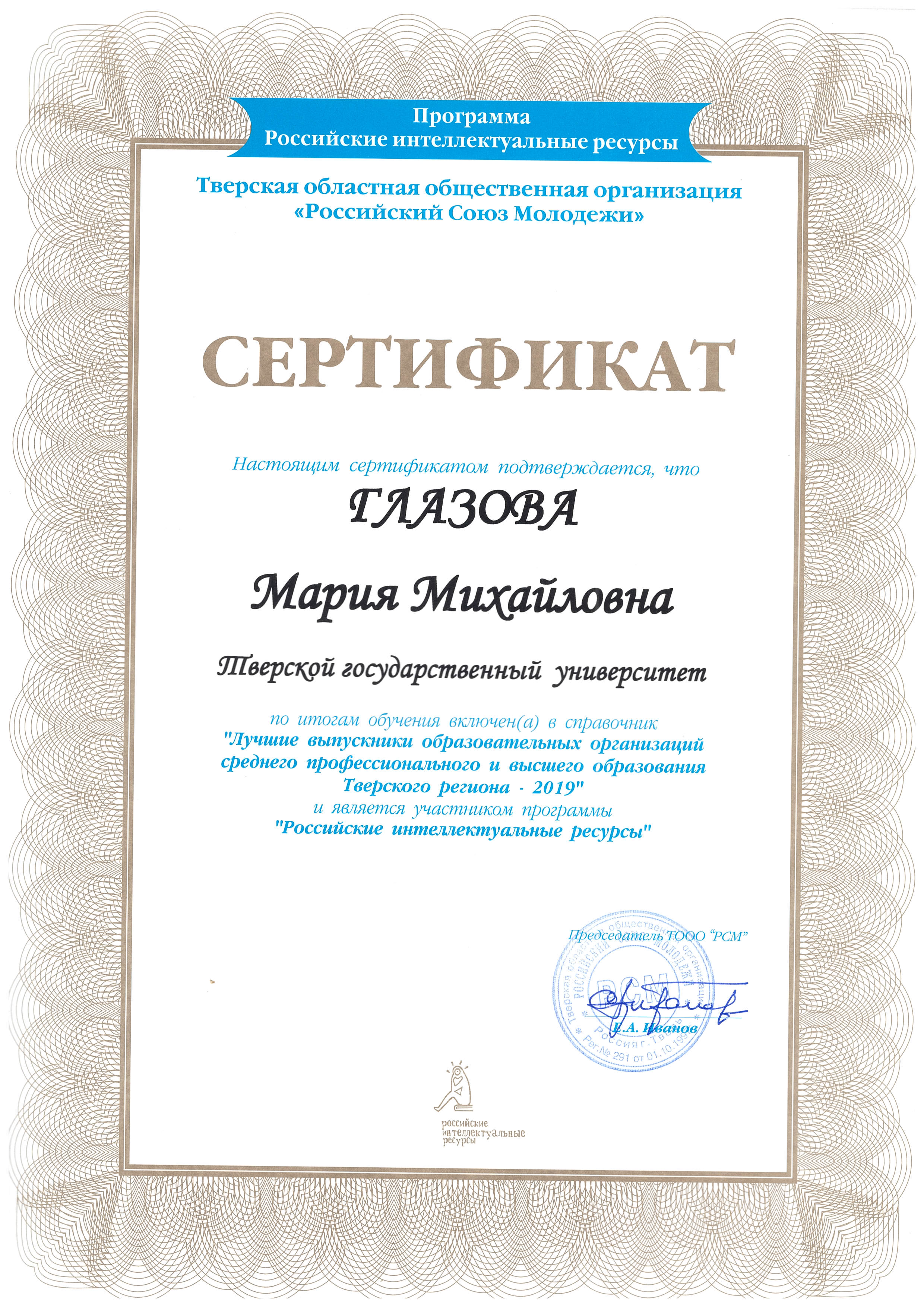 с 2021 г. - обучение в аспирантуре, направление подготовки 45.06.01 Языкознание и литературоведение, направленность (профиль) 10.01.01. Русская литература, очная форма обучения, ФГБОУ ВО «Тверской государственный университет».