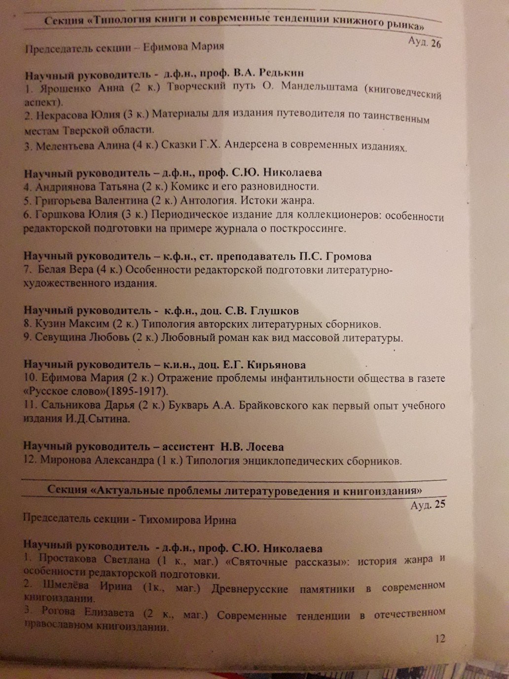 3. Ежегодная студенческая научно-практическая конференция ТвГУ , 2018 г. Темы выступлений: 1) "Евангельские тексты: проблемы редактирования"; 2)"Составление библиографического указателя по теме "Достоевский и Ницше".