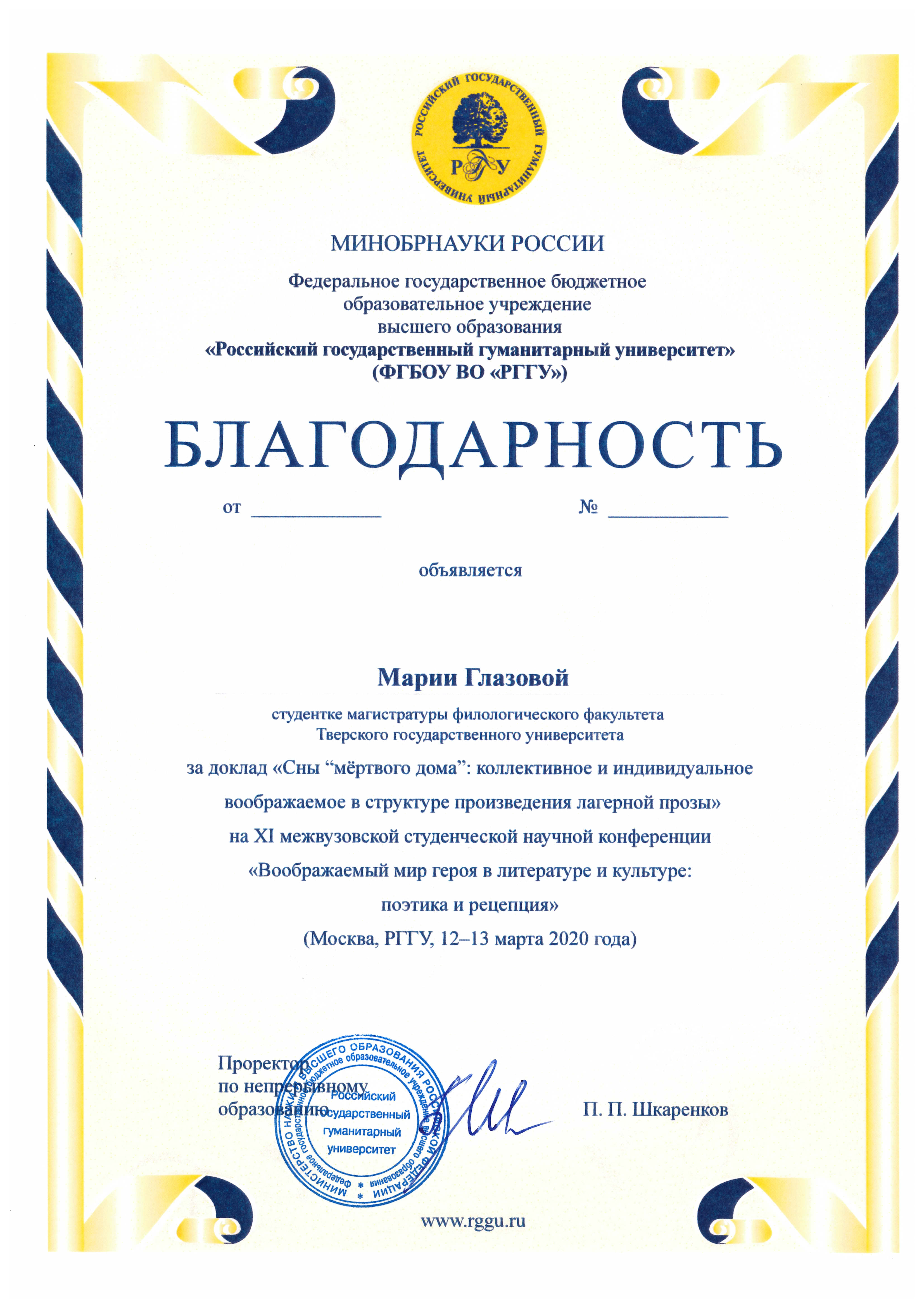 миров: поэтика и рецепция", РГГУ, г. Москва, 2020 г. Тема выступления - "Сны "мертвого дома": коллективное и индивидуальное воображаемое в структуре произведения лагерной прозы".