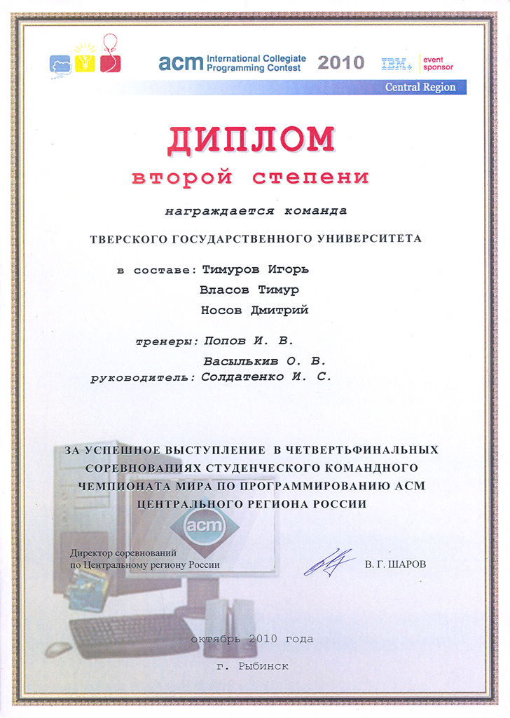 • Диплом второй степени за успешное выступление команды Тверского госуниверситета в четвертьфинальных соревнованиях студенческого командного чемпионата мира по программированию ICPC центрального региона России, 2010 г., г. Рыбинск (руководитель команды).