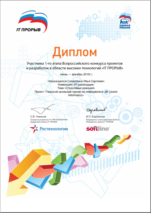 • Диплом участника 1-го этапа Всероссийского конкурса проектов и разработок в области высоких технологий «IT прорыв» за проект «Тверской школьный турнир по информатике JIN (Junior Informatics)», июнь-декабрь 2010 г.