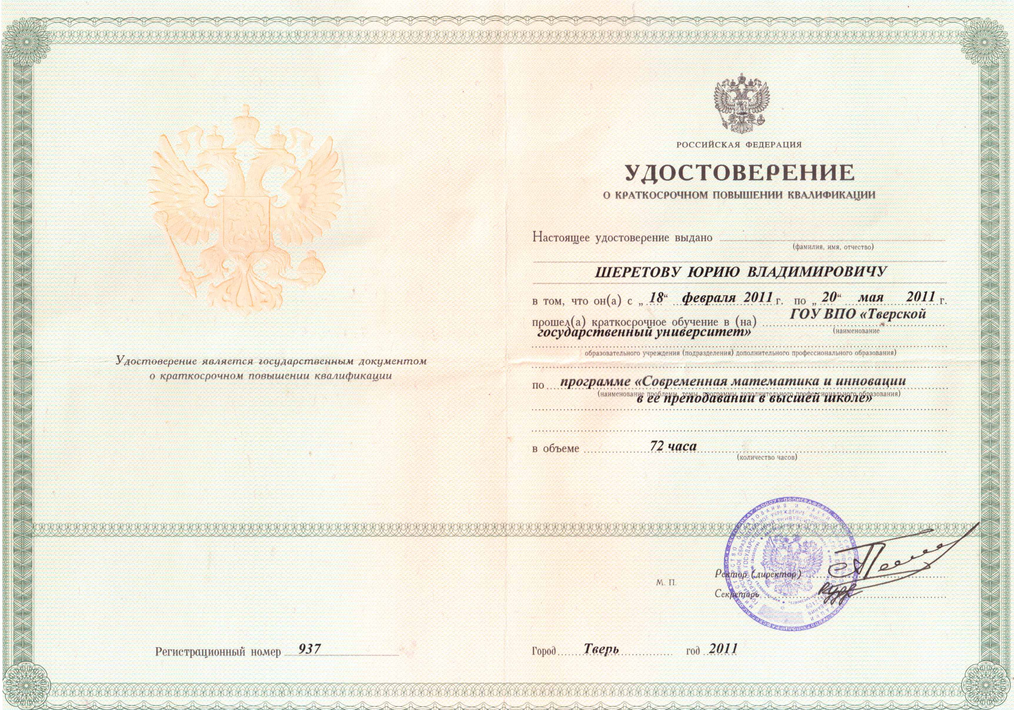 Удостоверение о краткосрочном повышении квалификации № 937, "Современная математика и инновации в её преподавании в высшей школе", 72 часа, ФГБОУ ВО "Тверской государственный университет":