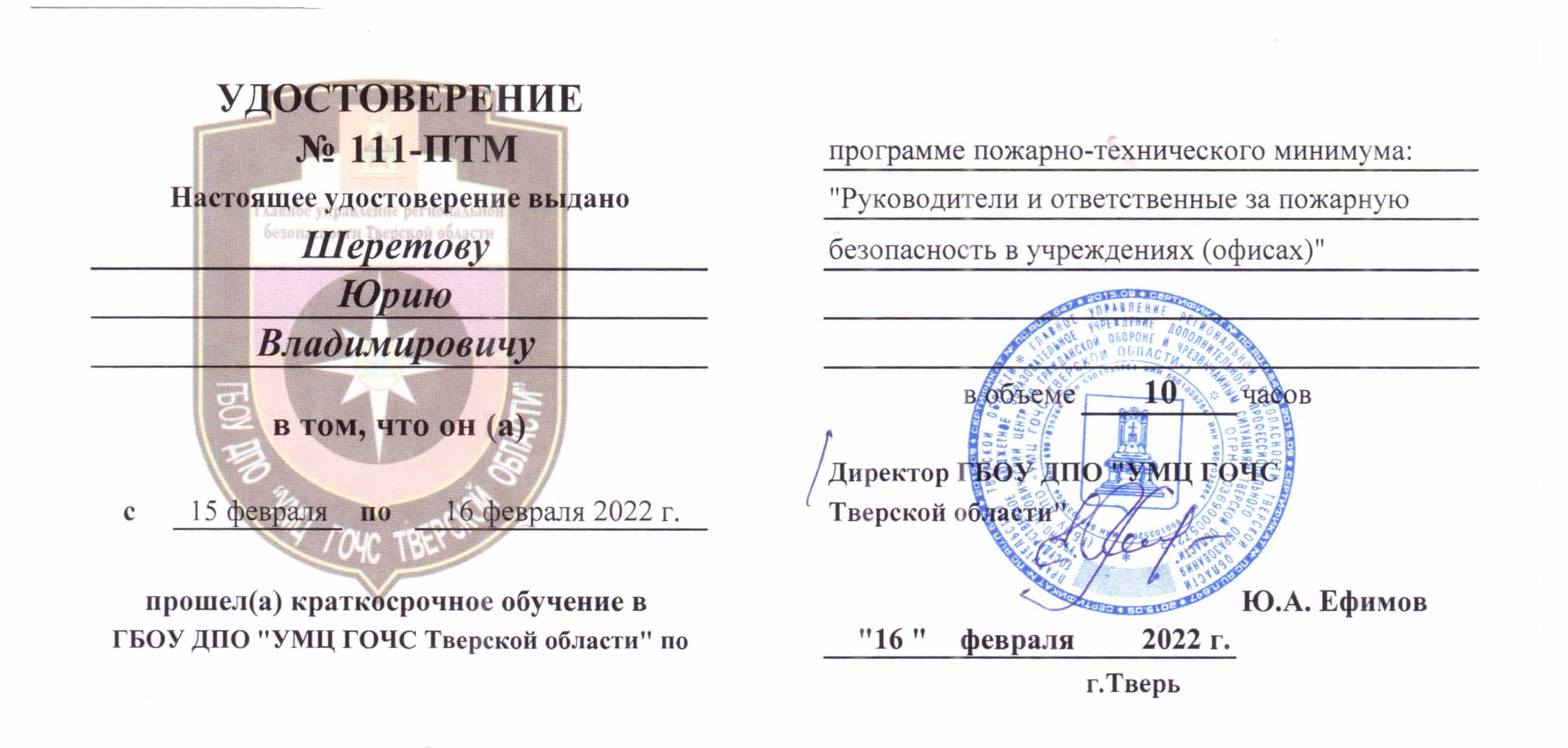 Удостоверение № 111-ПТМ от 16 февраля 2022 года о краткосрочном обучении по программе пожарно-технического минимума «Руководители и ответственные за пожарную безопасность в учреждениях (офисах)», 10 часов, ГБОУ ДПО  «УМЦ ГОЧС Тверской области» :