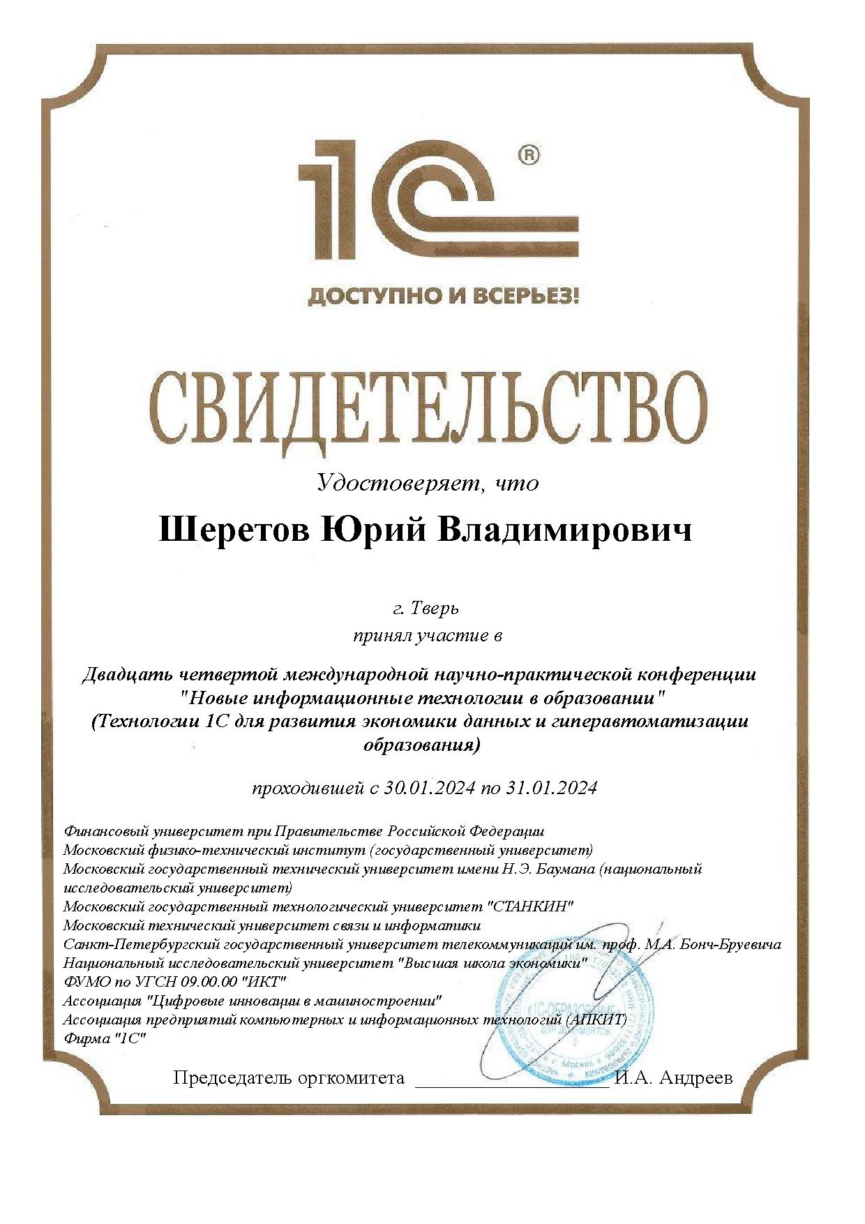 Свидетельство участника Двадцать четвертой международной научно-практической конференции "Новые информационные технологии в образовании" (Технологии 1С для развития экономики данных и гиперавтоматизации образования) , Москва, 30-31 января 2024, Частное образовательное учреждение дополнительного профессионального образования "1C-Образование".