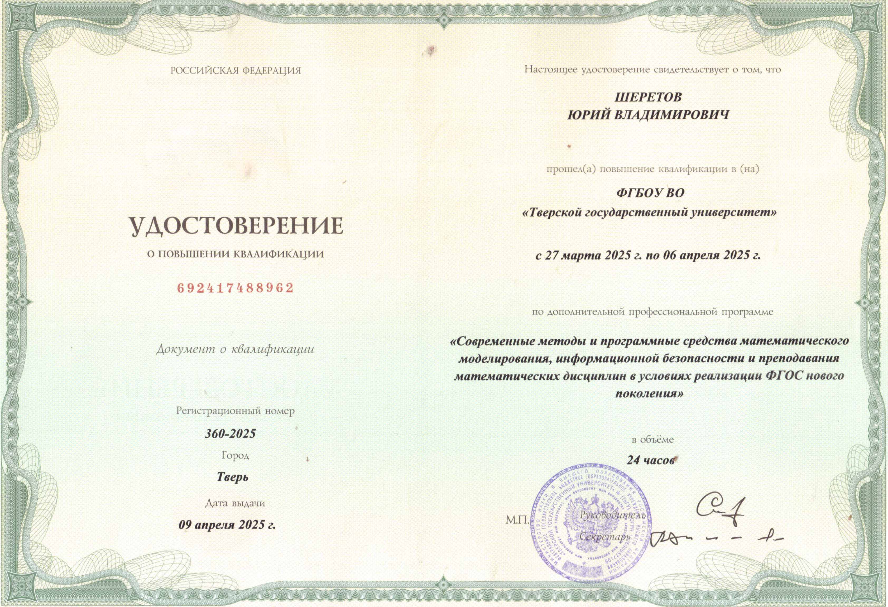 Удостоверение о повышении квалификации № 692417488962  от 09.04.2025 по программе «Современные методы и программные средства математического моделирования, информационной безопасности и преподавания математических дисциплин в условиях реализации ФГОС нового поколения», 24 часа, ФГБОУ ВО «Тверской государственный университет»: