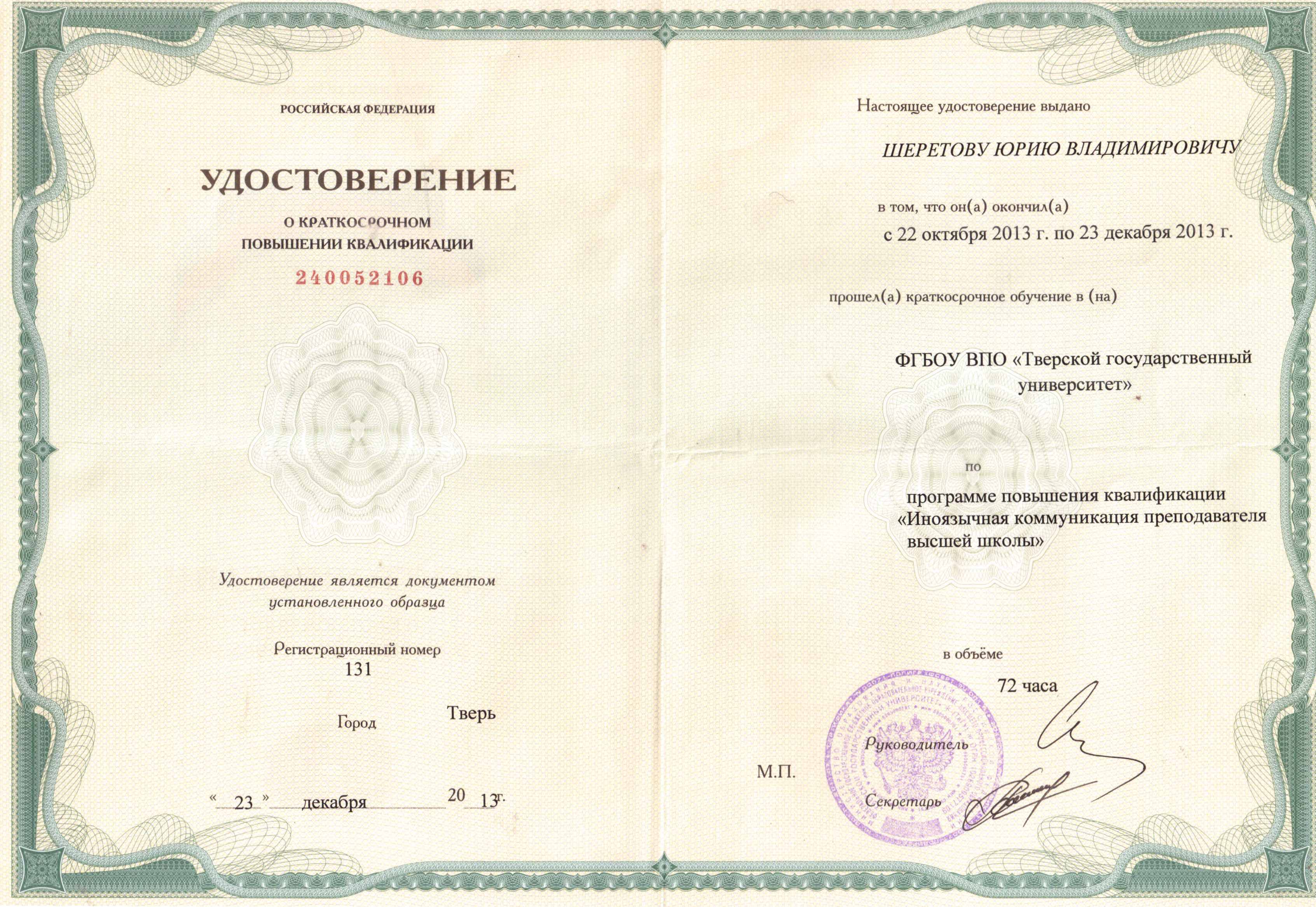 Удостоверение о краткосрочном повышении квалификации № 240052106 от 23.12.2013, "Иноязычная коммуникация преподавателя высшей школы", 72 часа, ФГБОУ ВО "Тверской государственный университет":