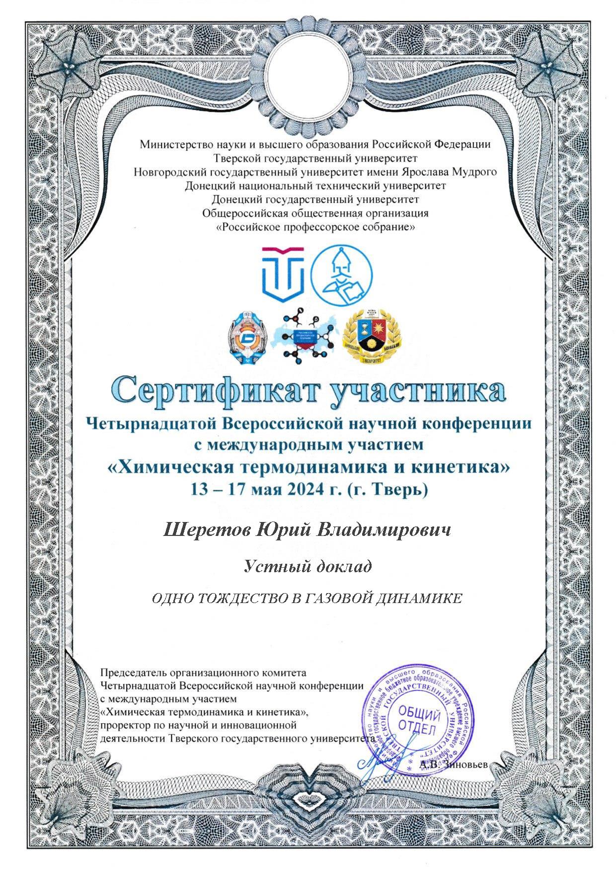 Сертификат участника Четырнадцатой Всероссийской научной конференции с международным участием «Химическая термодинамика и кинетика», г. Тверь, 13– 17 мая 2024 года: