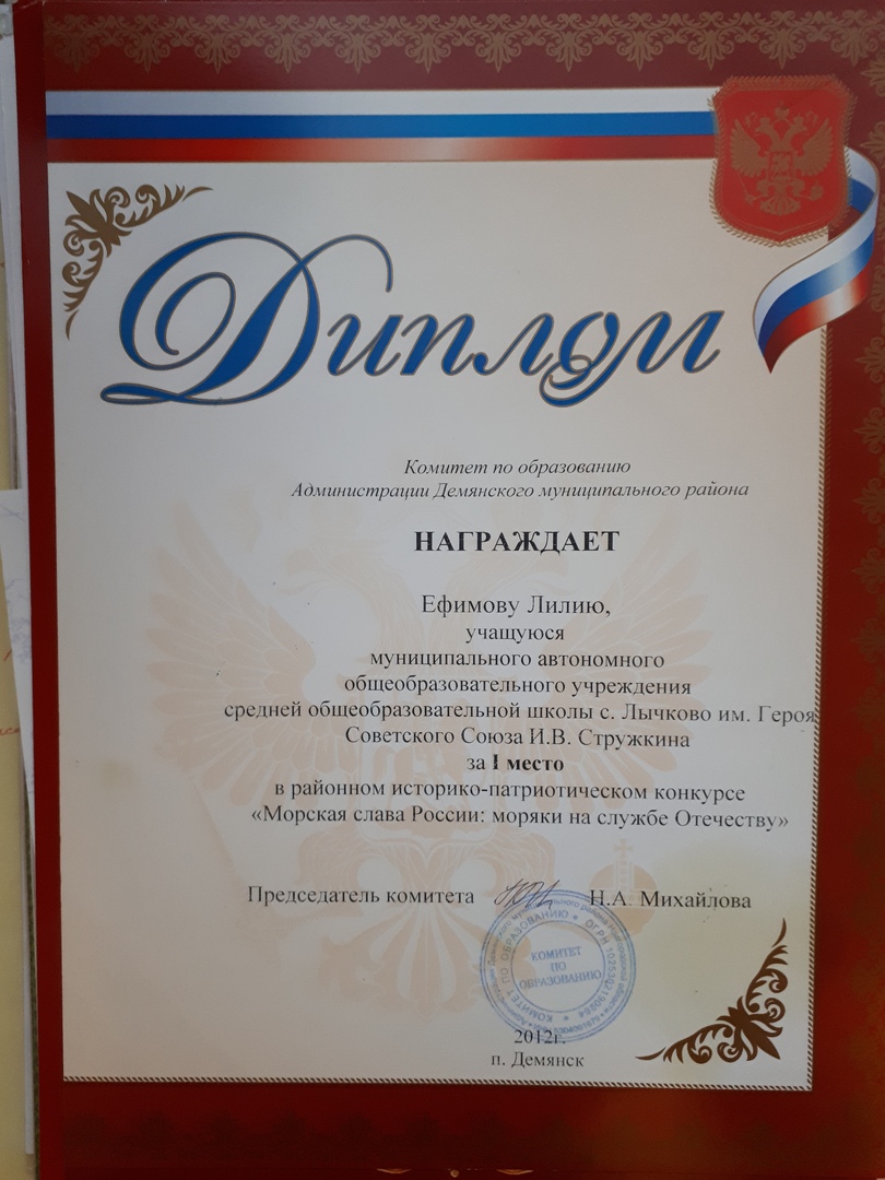 Победитель в районном историко-патриотическом конкурсе "Морская слава России:моряки на службе Отечеству"