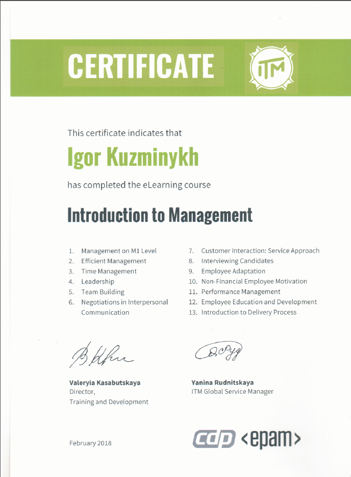 Участие во внутреннем Introduction to management курсе от компании EPAM Systems